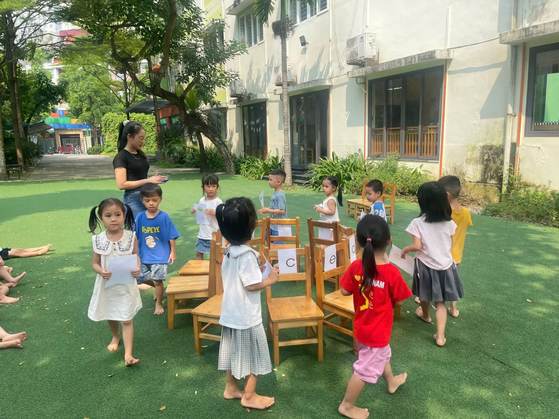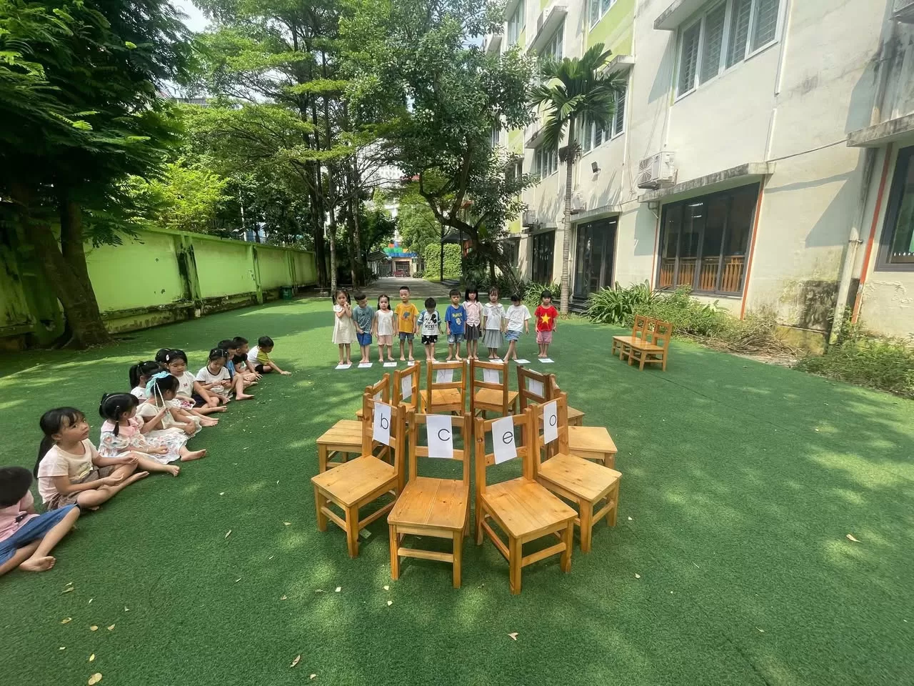 "Chiếc Ghế Âm Nhạc" là một trò chơi đơn giản nhưng đầy hấp dẫn. Khi nhạc vang lên, các bé sẽ đi vòng quanh những chiếc ghế được sắp xếp thành vòng tròn. Khi nhạc dừng lại, các bé nhanh chóng tìm ghế có dán chữ cái còn thiếu trên thẻ của mình.