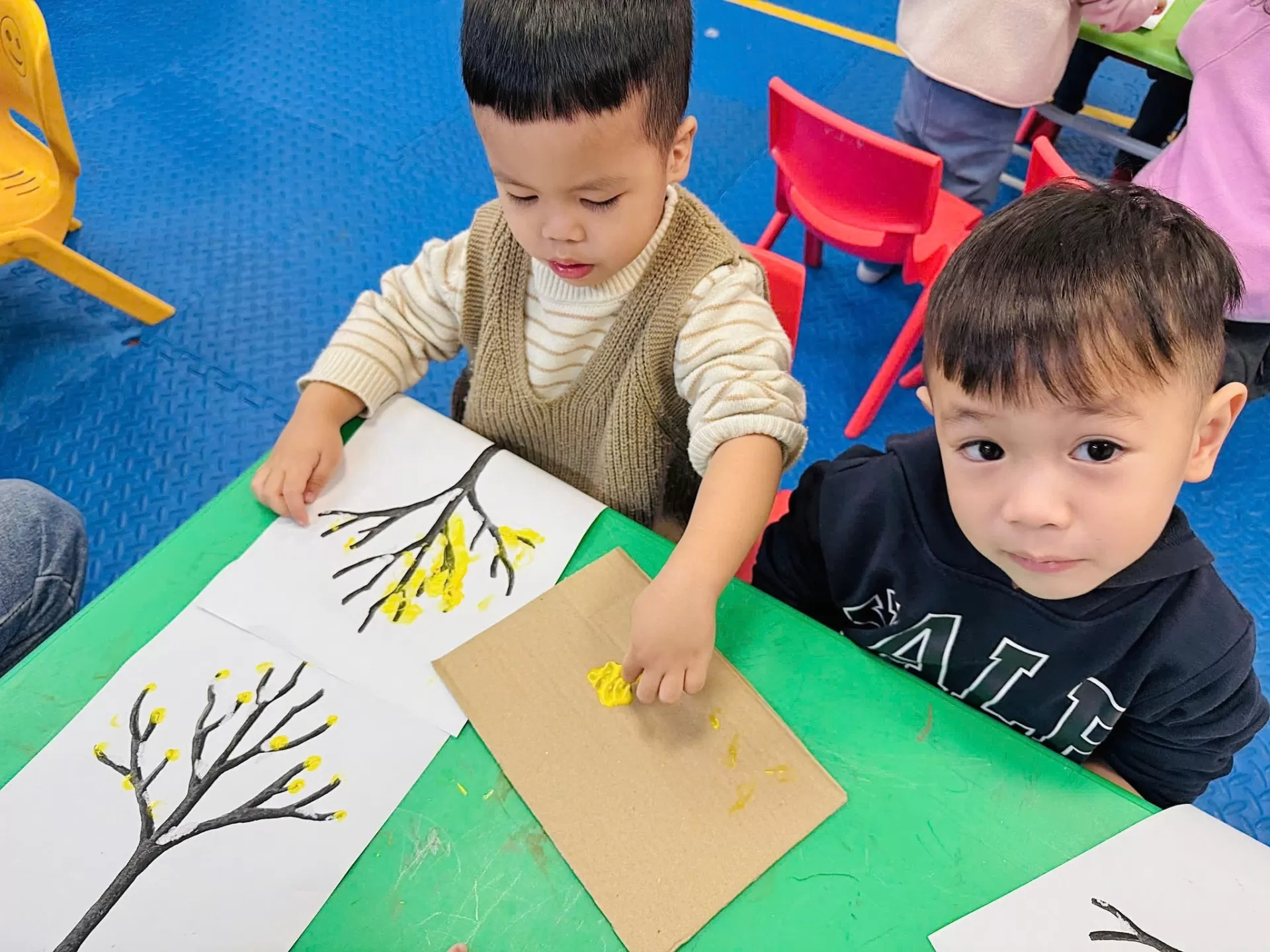 Không khí lớp học ngập tràn sắc màu, tiếng cười và sự tập trung. Nhưng phía sau những đôi bàn tay lấm lem màu vẽ, giá trị sâu sắc hơn đã được hình thành.