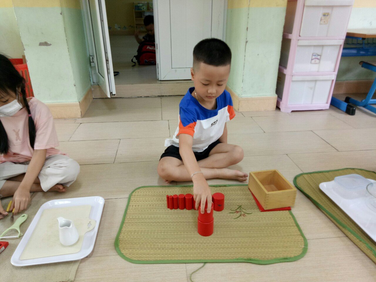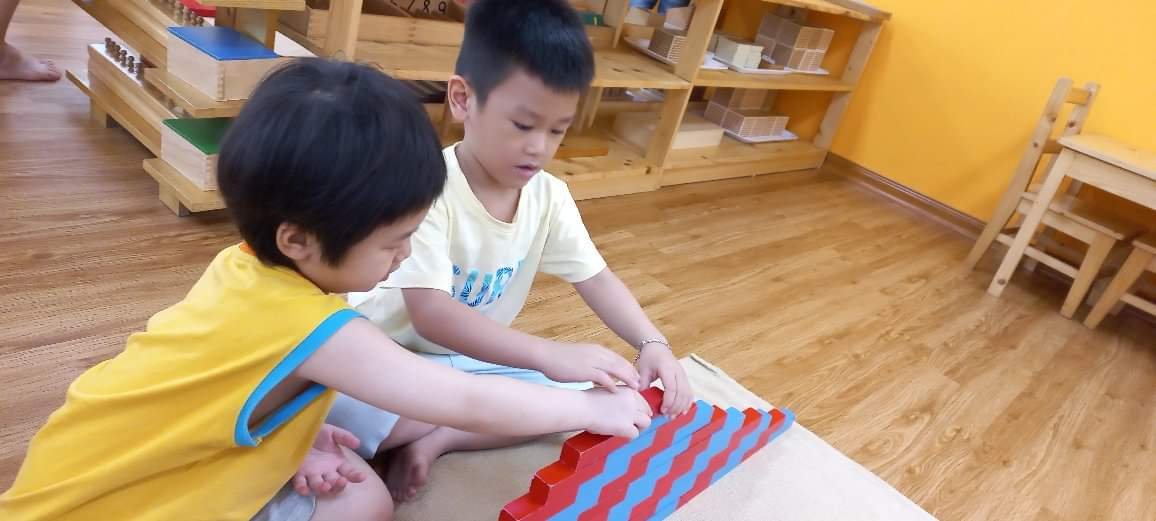 Bộ hình trụ có núm, tháp hồng, cầu thang nâu, cây gậy đỏ, tủ hình học, các hộp màu,…, trẻ sẽ được học cách quan sát để tăng khả năng nhận biết độ to – nhỏ, kích thước dài – ngắn, dày – mỏng, rộng – hẹp, hình dáng của các vật thể và phân biệt các loại màu và độ đậm nhạt của các màu,…